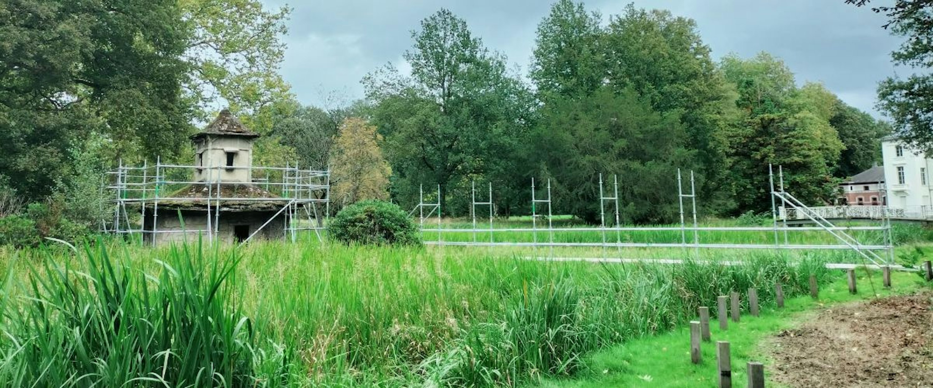 Le pavillon se trouve sur une île au milieu de l’étang du château. Pour la restauration, un petit pont a été construit depuis la berge, et un échafaudage a été monté sur la fabrique de jardin. Durant la Journée Chantiers Ouverts, vous pourrez observer de près les travaux de restauration, de l’intérieur au toit. Le restaurateur vous expliquera tout sur l’histoire, les matériaux utilisés, les techniques et le déroulement de la restauration.